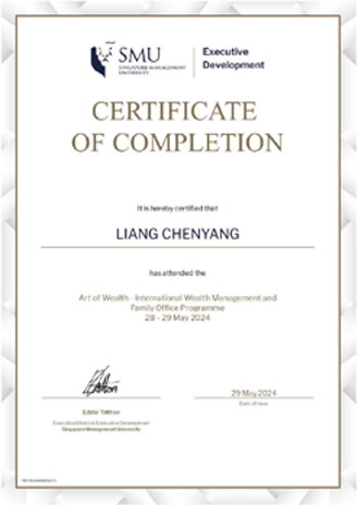 所有完成国际财富管理与家族办公室培训课程并达到要求的学员,都将获得由新加坡管理大学高管培训中心(SMU-ExD)颁发的认证证书、数字证书及徽章。